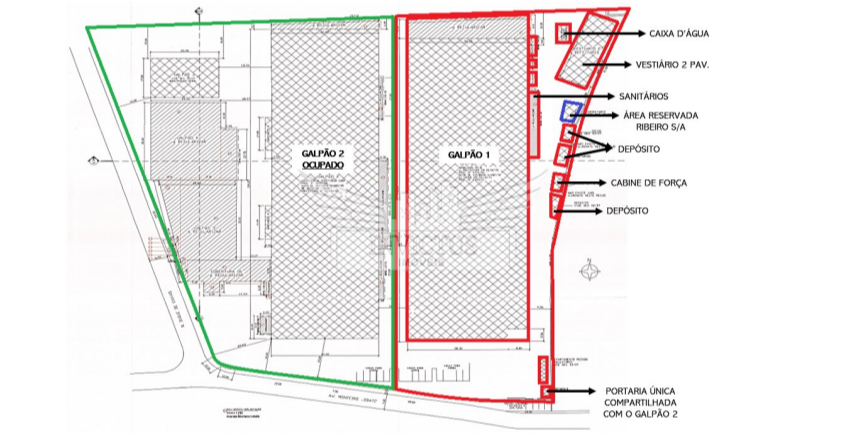 Ponte rolante, escritórios, banheiros, refeitório, vestiário, cozinha, deposito, docas.