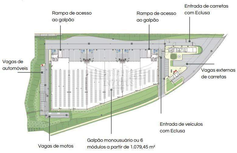 Construção moderna em pré-fabricado de concreto, (PADRÃO LAST MILE), mezanino será feito sob demanda, piso industrial, com resistência de 5 ton./m², pé direito de 12 metros livres, bombeiro J4, sistema de iluminação em led e exaustão natural, projeto conforme NBR 9050 (acessibilidade), portaria blindada individualizada tanto para carretas e carros pequenos.