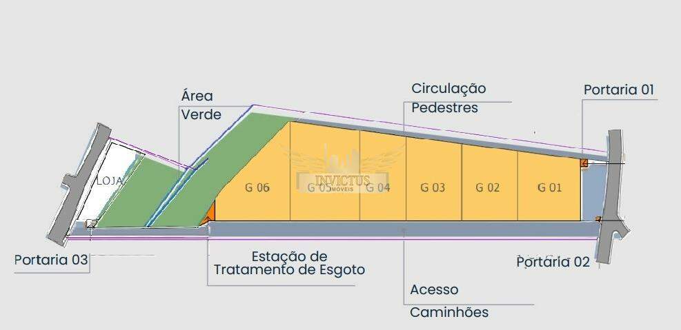- Mezanino: 1.912,59m² com resistencia de 500kg/m²;