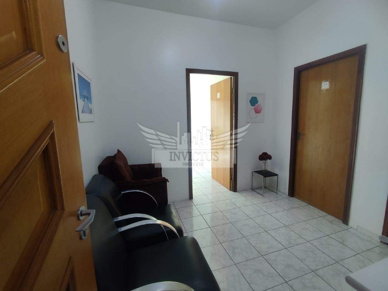 Sala ampla com recepção, banheiro e vídeo porteiro.